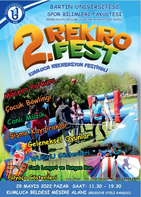 Turizm Rekreasyonu dersi kapsamında 2018 yılında birincisi düzenlenen Kumluca Rekreasyon Festivalinin ikincisi 29.05.2022 tarihinde düzenlenecektir. 5-21 yaş arasındaki bireyleri kapsayacak etkinliklerle; dezavantajlı grupları desteklemek, bu tür faaliyetlerden uzak kalan kişilerin sosyal gelişimine katkıda bulunmak ve kurumlar arası sosyal etkileşimi geliştirmek amaçlanmaktadır. Etkinlik kapsamında; Canlı Langırt, Bungee Run, Ayak Dartı ile Şişme Kaydırak, Fil Kaydırak, Sevimli Kedi Yatay Şişme Oyunu, Geleneksel Oyunlar, Canlı Müzik Aktiviteleri, Palyaço ve Sahne Sanatları Gösterileri, Takım ve Bireysel Parkur Oyunları, Wushu Dünya Şampiyonlarının Taulu Gösterisi gerçekleştirilecektir. Etkinliğe Sosyal Hizmetler İl Müdürlüğü’nden hizmet alan tüm kuruluşlar ile üniversitemiz öğrenci ve akademisyenleri aileleriyle birlikte davetlidir.