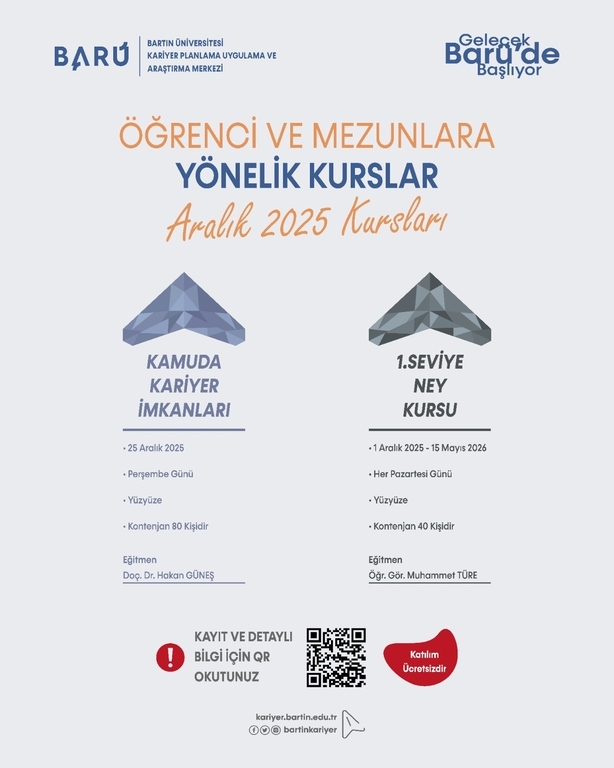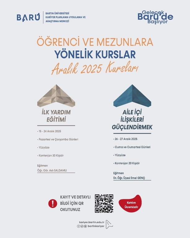Üniversitemiz öğrenci ve mezunlarının kariyer gelişimlerine katkı sağlamak amacıyla, birimlerimizin desteğiyle açılan ücretsiz kurslar kapsamında; 2025 Yılı Aralık ayı kurs başvuruları başlamıştır. Öğrenci ve mezunlar kurs başvuru formuna, aşağıda yer alan link bağlantısı üzerinden, birimimiz web sayfası ve sosyal medya hesaplarından ulaşabilirler. Kurs kontenjanları kısıtlı olup, konunun tüm öğrenci ve mezunlarımıza duyurulur.